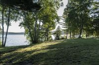A serene landscape in Canada, featuring a lake surrounded by residential homes and lush vegetation. The sunlight casts shadows across the evergreen trees, creating a peaceful atmosphere. A perfect getaway for nature lovers.