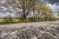 A rural road in Ontario, Canada, surrounded by lush green vegetation. The asphalt road surface leads to a tree-lined driveway with a beautiful landscape. Clear blue sky and fluffy clouds create a picturesque scene.
