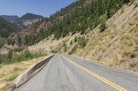 This image captures a scenic landscape in British Columbia, Canada. The straight asphalt road leads through a lush forest and into the mountains. The clear sky above contrasts with the vibrant green vegetation on the slopes. The road surface is smooth and well-maintained, with a guard rail and Armco barriers ensuring safety. This photo represents the natural beauty and infrastructure of the highlands in British Columbia. It is a perfect depiction of a day in the mountainous region of Lillooet.