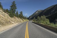 A breathtaking view of a mountain road in British Columbia, Canada. The asphalt road winds through the stunning landscape, surrounded by majestic mountains and lush vegetation. The clear sky and straight road create a captivating POV perspective.