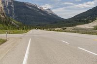 This is a breathtaking landscape photo of a road surrounded by mountains in Canada. The asphalt road stretches along the slope, blending seamlessly with the natural beauty of the surroundings. Lush vegetation and trees line the road as fluffy clouds float above. This image captures the essence of a sunny day in the stunning provinces of British Columbia and Alberta. It is a perfect representation of the harmonious coexistence of man-made infrastructure and the untouched beauty of nature.