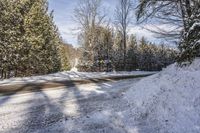 This is a beautiful landscape image taken in Ontario, Canada. The photo captures a road surrounded by a forest of trees, covered in snow. The clear sky is adorned with fluffy clouds, creating a picturesque scene. The road surface is covered in a layer of snow, reflecting the freezing temperatures. The trees and branches are also coated in snow, adding to the winter scenery. The image showcases the natural beauty of Ontario and the peacefulness of a snowy day. This photo would be perfect for showcasing the natural wonders of Canada.