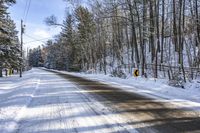 This is a scenic image of a winter landscape in Ontario, Canada. The photo captures a road covered with snow, surrounded by a beautiful forest and trees. The clear sky with fluffy clouds adds to the serene atmosphere. The road surface is covered in snow, creating a picturesque view. The vegetation on the sides of the road is covered in a layer of frost, highlighting the winter season. A hard shadow is cast by the trees, creating a sense of depth and perspective. This photo represents the natural beauty and tranquility of the Ontario landscape during winter.