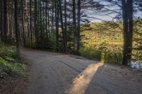 A scenic landscape in Ontario, Canada. A dirt road winds through a forest of larch trees, their trunks casting hard shadows. The road surface transitions from dirt to gravel, leading to a picturesque lake. Clear skies create beautiful reflections on the water.