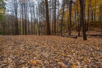 This image showcases a beautiful landscape in Ontario, Canada. It features a wooded area with a lot of leaves covering the ground. In the foreground, there is a wooden log adding a natural touch to the scene. The clear sky above complements the open space, creating a serene and peaceful atmosphere. This photo captures a typical day in Ontario, with the trees displaying their autumn colors. The incidental people in the background add a sense of scale and highlight the vastness of nature. It represents the beauty and tranquility of the natural environment in Toronto, Ontario.