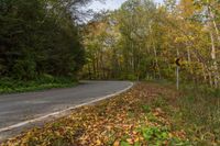 an empty, empty country road with yellow leaves on the ground and on the trees