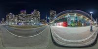 A futuristic cityscape in Toronto, Canada. Modern architecture and high-rise buildings dominate the skyline. Straight roads and a bustling intersection create a vibrant urban atmosphere. The fisheye lens captures the metropolis in all its glory.