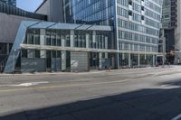 A bustling street in downtown Toronto, Canada. People walking and going about their day in the city's business district. Modern architecture with glass walls reflects the clear sky. A vibrant metropolitan area with a mix of residential and office buildings.