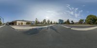 Aerial view of a skate park in Toronto, Canada. The modern architecture of the mixed-use neighborhood stands out against the clear sky. The open space is surrounded by residential areas and tree-lined streets. A perfect spot to enjoy city life.