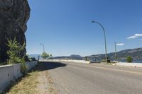 A scenic coastal road in British Columbia, Canada. The road winds through majestic mountains, offering breathtaking views of the ocean and rivers. Clear skies highlight the lush vegetation and rock walls along the road. Street lights and guard rails ensure safe travel along this picturesque thoroughfare.