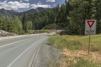 a red triangle is in the middle of the road near the tree line and mountains