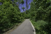 A scenic view of the lush green landscape along a road in Ontario, Canada. Towering trees create a canopy over the road surface. Clear sky overhead adds to the natural beauty of the area.