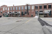 the empty parking lot has only snow on the ground in front of an old brick factory