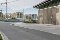This is an image of a residential area in Toronto, Canada. The photo shows a road with asphalt surface surrounded by buildings and vegetation. The neighborhood has a mix of different architectural styles. The clear day sky and clouds can be seen in the background. The image represents urban design and the construction of public spaces in the city. The road surface and curbs indicate a well-maintained area. In the foreground, there is a land lot where a new hotel is being constructed. This is a typical scene in the bustling city of Toronto.