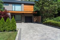 A suburban home in Ontario, Canada. The brick-paved driveway leads to a large wooden garage door, surrounded by lush shrubs and trees. Sliding glass doors offer a view into a peaceful courtyard.