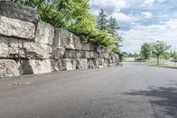 A straight road in suburban Ontario, Canada. Lined with trees and stone walls, this low-traffic thoroughfare provides a scenic drive. The smooth asphalt road surface is well-maintained, making it perfect for a leisurely drive.