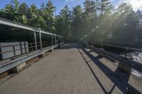This image captures a paved bridge in Toronto, Ontario, Canada. The bridge is surrounded by tall trees and sunlight creates bright shadows on the road surface. Benches on each side of the road provide a place for people to relax and enjoy the view of the nearby lake. The clear blue sky and fluffy clouds add to the sunny atmosphere. The concrete barriers and guard rails ensure the safety of motorists. This photo represents a beautiful day in Toronto, with the sun visible and sunshine reflecting on the water.