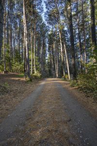 This is an image of a straight road in Ontario, Canada. The asphalt road surface is surrounded by a forest and grassy landscape. The road stretches straight towards the horizon, creating a sense of depth and perspective. Tall trees line the sides of the road, their branches and trunks casting shadows on the ground. The clear sky overhead illuminates the scene, while a larch tree stands prominently in the foreground. This photo captures the beauty of a peaceful road journey through the scenic landscapes of Ontario, near Toronto.