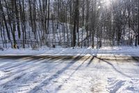 A snowy landscape in Ontario, Canada. The road is covered in snow, with a yellow caution sign visible in the woods. The sun casts long shadows on the high trees, creating a picturesque winter scene.