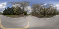this is a very fish eye view of the two roads in the sky and a few trees