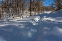 the tracks are shaped by tree shadows in the snow of a path through the woods