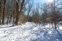 snow covered trail leading to trees in a snowy woods area with blue sky and sun rays