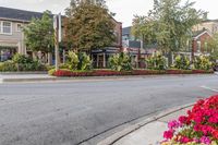 This is an image of a residential neighborhood in Ontario, Canada. The classic architecture of the suburban houses is highlighted against the gloomy backdrop of a grey autumn sky. The street is lined with trees, shrubs, and flowers, adding a touch of color to the scene. The road surface, made of asphalt, leads to the foreground where a street light stands. This photo captures the essence of a typical day in a quiet residential area in Toronto, Ontario. In the distance, the Niagara region can be seen.