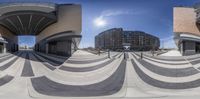 A suburban neighborhood in Ontario, Canada. The photo captures a clear day in Toronto, with houses lining the straight road. The circular photos on the street surface create interesting shadows in the open space.
