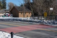 A suburban road in Ontario, Canada, lined with snow-covered sidewalks. Clear sky above contrasts with the asphalt road and traffic lights. A perfect day for recreational activities in Toronto's residential suburbs.