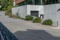 This is an image of a residential area in Toronto, Canada. The photo captures the urban design and architecture of the neighborhood, with high-rise buildings and residential properties. The road and asphalt surface are surrounded by grass, trees, and vegetation. The image shows the shadows of fences and trees, as well as the curb and road surface. The photo represents a suburban public space in Toronto, with the slope and hard shadows adding depth to the scene. In the background, there is a theater with an elevated fixture. This image showcases the urban landscape and design of Toronto.