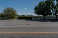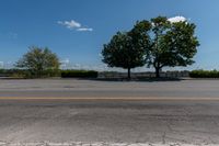A profile view of a suburban road in Canada. The asphalt road leads towards the iconic Niagara Falls, with the Toronto skyline and trees in the background. Clouds fill the sky on a sunny day.
