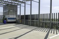 This is an image of a blue and white bus parked in front of a metal fence and a tall building in Toronto, Canada. The urban landscape shows the city's urban design with concrete surfaces and parking decks. The clear sky above contrasts with the clouds rolling in. This photo represents a typical day in the city, showcasing the urban infrastructure and warehouses.