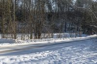 A picturesque winter landscape in Canada. Snow-covered forest with a road cutting through. Clear sky and freezing temperatures create a serene atmosphere. Nature at its best in Toronto.