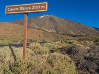 A rural landscape in Tenerife, Canary Islands. The sign points to a mountain in the distance, surrounded by vegetation and grassy slopes. Clear sky sets the backdrop for this picturesque scene in Spain's national park.