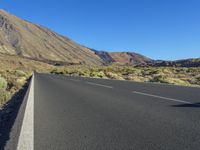 This is an image of a paved highway in the Canary Islands, Spain. The road surface, made of asphalt and tar, winds through a rural landscape with low grass and vegetation. In the distance, a large mountain range dominates the horizon. The clear sky above highlights the natural beauty of Tenerife, a popular destination in Europe. This photo captures the serenity of the area, with the mountain slopes and national park adding to the picturesque scenery. A perfect representation of nature in the Canary Islands.