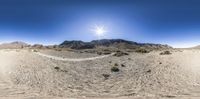 a 360 - view picture of mountains in a desert landscape with a sun shining over the top