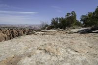 trees line the edge of a cliff next to a canyon of rocks and greenery