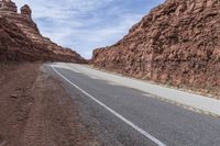 A gloomy day in Canyonlands National Park, Utah. Rugged red rock canyons and steep slopes create a dramatic landscape. Grey sky casts a hard shadow over the desert. A desolate road winds through the canyon, surrounded by stone walls and mountain landforms.