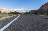 A straight, low-lying road stretches out into the breathtaking desert landscape of Canyonlands, Utah. Red rock mountains stand tall against the clear dawn sky. Explore North Wash and Sandthrax Highway on this scenic drive.