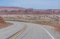 the winding road is covered by rocky cliffs and desert like terrain as a lone motorcycle passes through it