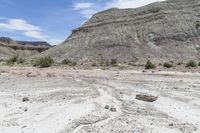 a dirt field filled with rocks in the middle of it and mountains in the background