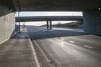 This stock photo depicts cars driving on an empty highway under a bridge at dusk in Los Angeles, California, USA. The image showcases the city's architecture and infrastructure, with the asphalt road and concrete bridge creating a visually appealing scene. The sunlight adds a warm glow to the surroundings, highlighting the public space beneath the bridge. The parking lot and road surface are clearly visible, providing a realistic portrayal of the urban environment. This vibrant image captures the essence of a sunny day in Los Angeles.