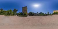 An elevated view of a castle in Cordoba, Spain, surrounded by desert vegetation. The clear sky and top-down perspective highlight the architectural beauty and open space. Perfect for a leisurely vacation or recreational activities.