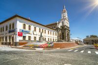 A profile view of Catedral La Matriz de Cotacachi in the town square of Cotacachi, Ecuador. The clear sky contrasts with the urban architecture and roads, capturing the essence of city life in this charming Ecuadorian town.