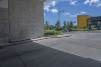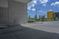 A yellow fire hydrant stands prominently in the middle of a cement parking lot near tall buildings in Toronto, Canada. The urban landscape is characterized by grey walls and concrete surfaces, with a clear blue sky and clouds overhead.