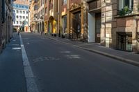 Classic architecture in the charming city of Strasbourg, France. Shadows cast by storefronts add depth to the urban landscape. A bustling street with restaurants and shops, showcasing the vibrant urban design of the city.