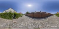 A picturesque street in Berlin, Germany, lined with charming houses and brick pavement. The straight road leads to a symmetrical cityscape, showcasing a mix of modern and classic architecture. The clear sky forms a perfect backdrop for this vibrant European city scene.
