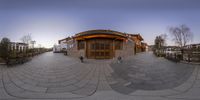 a circular photo of an exterior at sunset, and a house on the other side