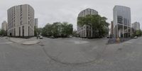 Empty street in downtown Chicago, Illinois. Classic architecture and office buildings line the road. Grey sky reflects off the asphalt, creating a moody atmosphere. A quiet day in the bustling business district.