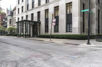 This is an image of a classic architecture building in the business district of Chicago, Illinois. The grey sky contrasts with the architectural details of the building facade and the surrounding infrastructure. The roads and lanes are made of asphalt, while the trees line the curb of the urban neighborhood. The photo captures a typical day in Chicago, showcasing the mix of office buildings and residential properties. This image represents the bustling business atmosphere in the city.